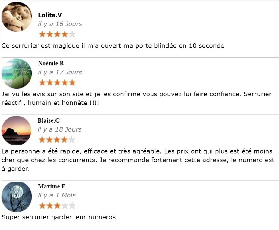 Parce qu'un problème de Serrure ou de Porte peut vite devenir dramatique,Nos Artisans sontdisponibles à tout moment et interviennent pour les professionnels et les particuliers.Ils sonttrès Réactif et se rendront à votre domicileen moins d’une heure. Ils sontégalement disponible le weekend.